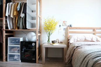 這次的空間改造是和陶藝家合作,一起完成他的住所。因為房間是租屋的關係,配置上以家具軟裝為主,選擇淺色系木質輔以白色的百搭家具,即使搬家也很容易隨著租屋原況轉換不同風格,本次讓木材質搭配陶藝家的手感陶器作品,突顯天然素材的質樸,適度的白色,點綴清新的小型綠植,營造自然溫馨氛 圍的清新無印風。